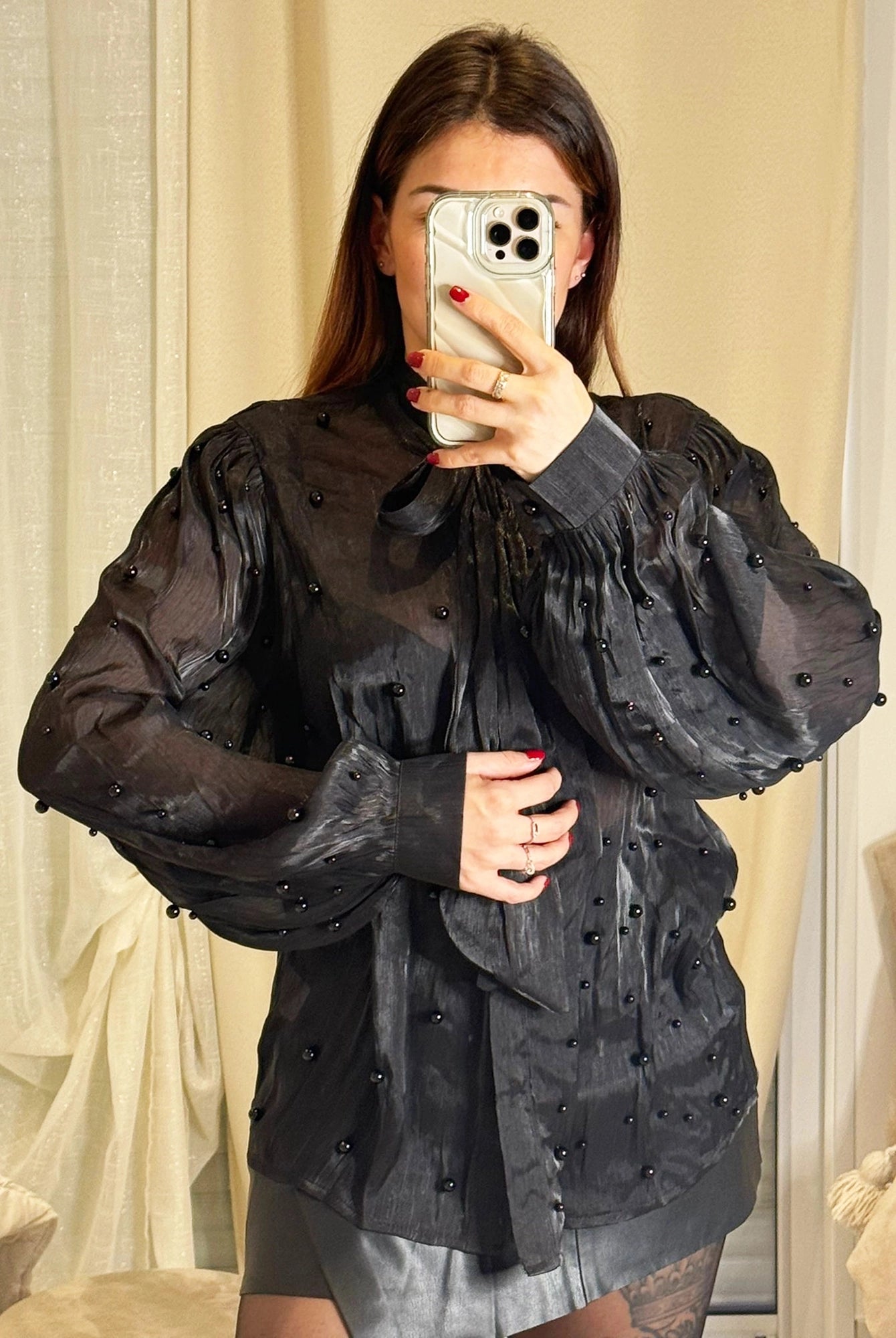 Élise - Blouse Voile Noir et Perles avec Manches Ballon et Nœud Col Femme