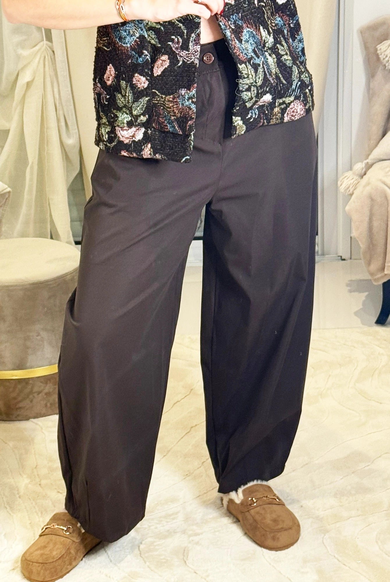 Pantalon Meylie, le confort absolu pour un style décontracté chic. Ce pantalon wide leg marron foncé en matière fluide devient instantanément votre pièce polyvalente préférée de la saison.